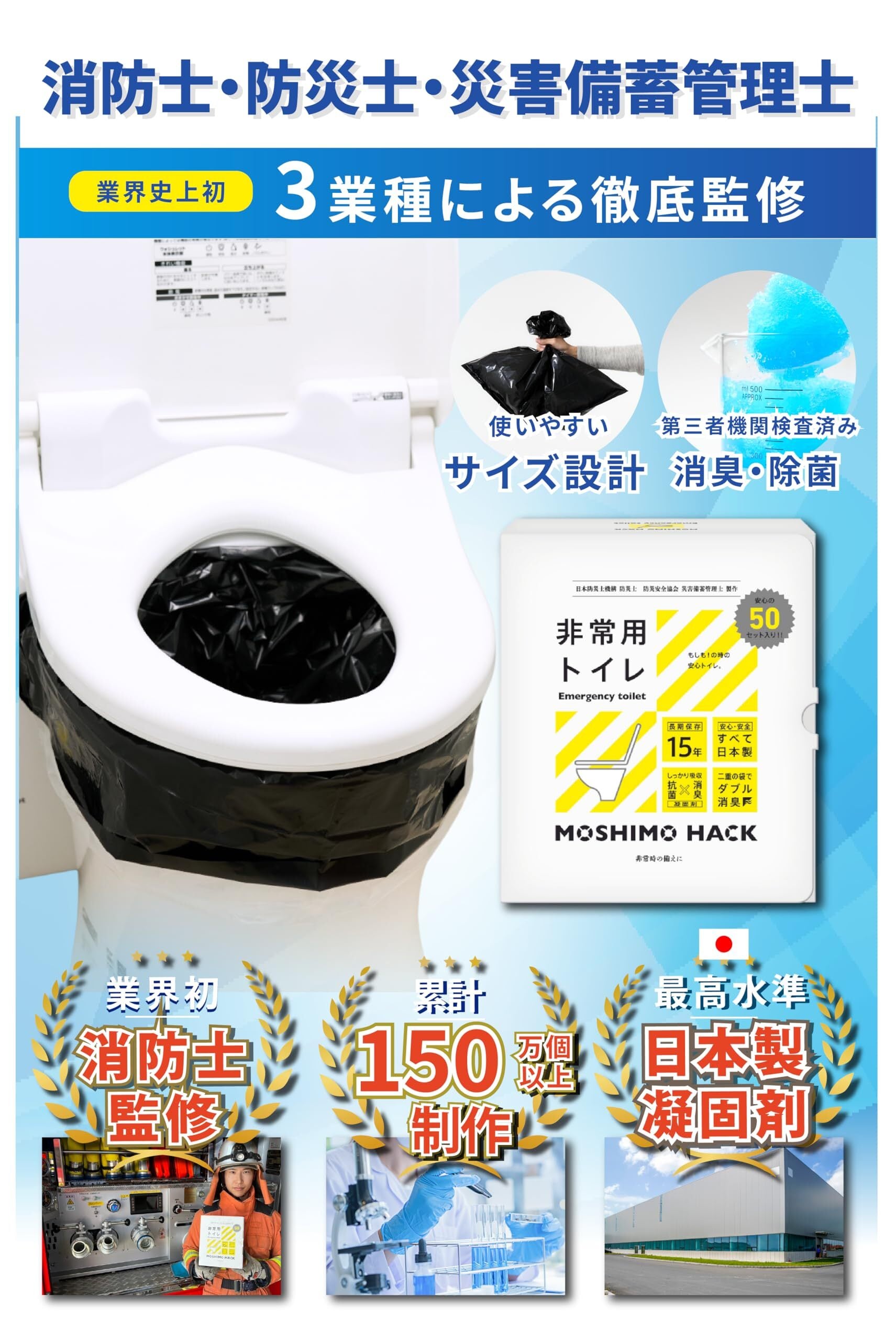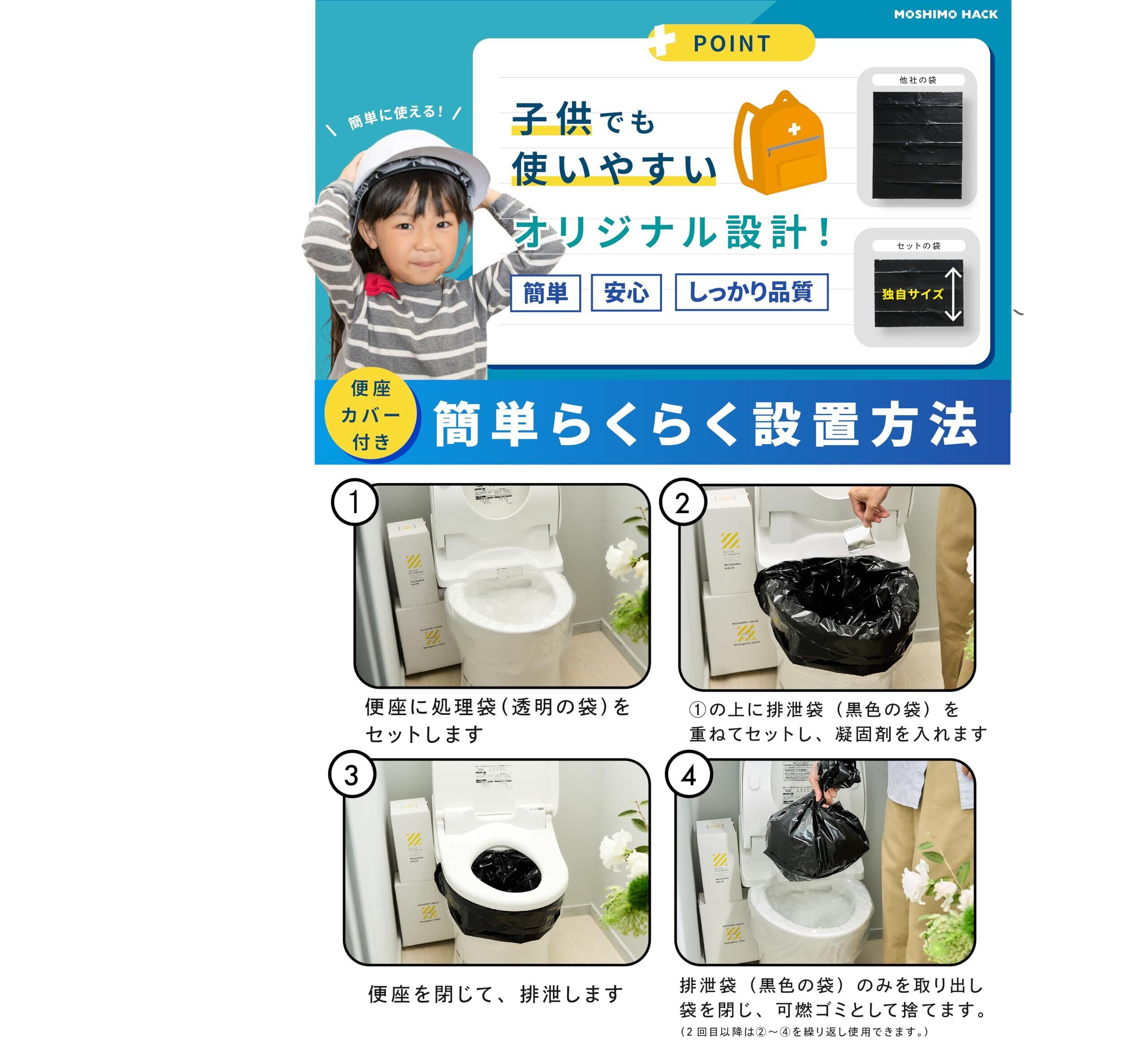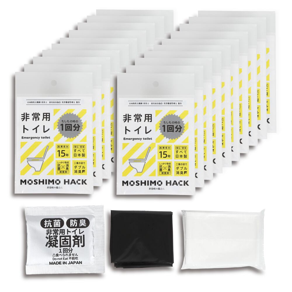 MOSHIMOHACK 非常用トイレは、予期しない緊急時に私たちの生活を守るためのアイテムです。この製品は100回分の使用が可能。コンパクトに収納できるため、ご家庭の備蓄に最適です。使い方はシンプルで、特別な準備は不要。必要な時にサッと取り出して、安心して利用することができます。デザイン性も配慮されており、目立たずスマートに保存できるため、導入しやすいのが特徴です。