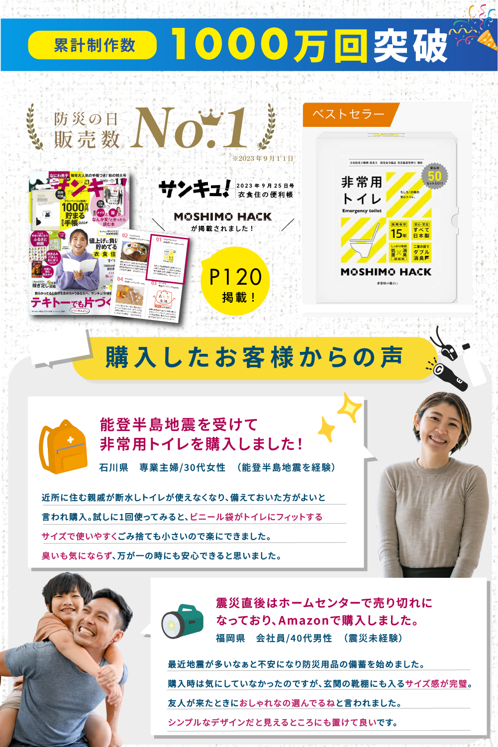 MOSHIMOHACK 非常用トイレは、予期しない緊急時に私たちの生活を守るためのアイテムです。この製品は50回分の使用が可能。コンパクトに収納できるため、ご家庭の備蓄に最適です。使い方はシンプルで、特別な準備は不要。必要な時にサッと取り出して、安心して利用することができます。デザイン性も配慮されており、目立たずスマートに保存できるため、導入しやすいのが特徴です。